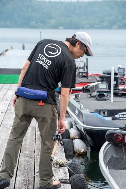 つり人の「つ」をフック風にアレンジしたロゴをTシャツの左胸、バックに大きく配置したデザイン。